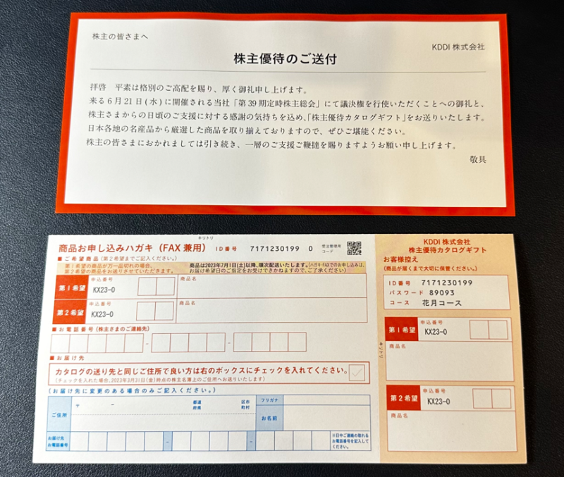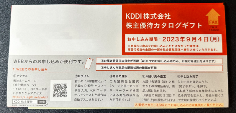 本日、KDDI様から株主優待のカタログギフトが届きました!