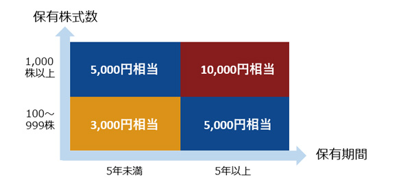 1,000株以上でも5,000円相当、1,000株以上で5年以上保有だと10,000円相当になるそうです。