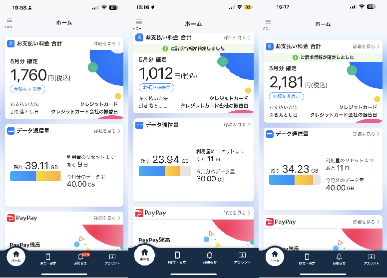今までdocomoでは家族で7G利用で平均 9,000円~10,000円 かかっていたので、半額くらいになりましたよ。それと見て欲しいのは、データ通信量です。なんか家族それぞれ繰り越せるので、めちゃくちゃ余ってしまっているんですよね^^;