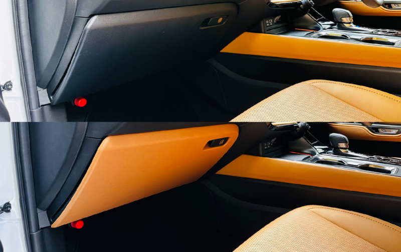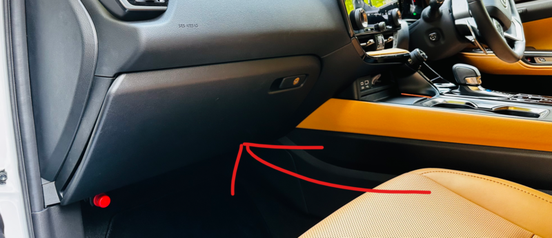 愛車、新型NXの内装色はヘーゼルという色なのですが、助手席側のニーパッドとグローブボックスの色はダッシュボードと同じ黒なんです。