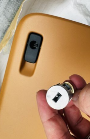 鍵シリンダーの後ろの金色の部分がストッパーになってますので、これをマイナスドライバーなどで押せば取り外すことができます。